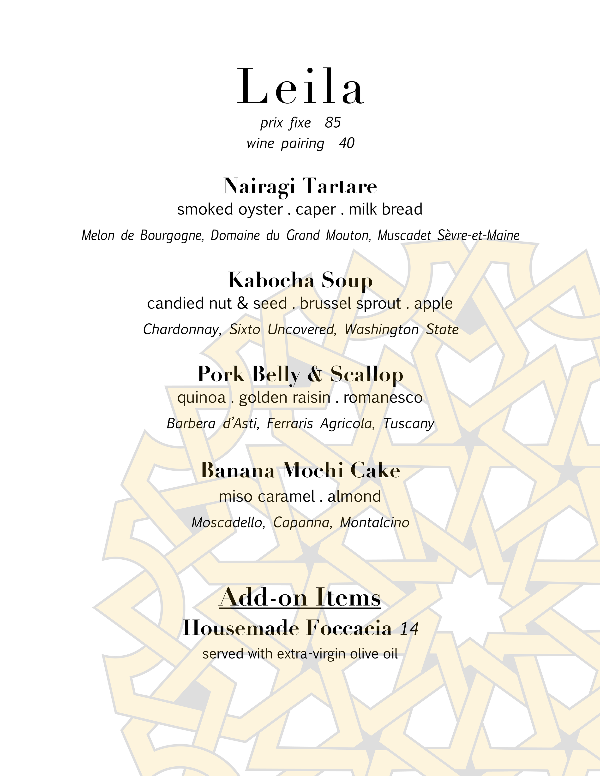 We are now serving an Italian forward, prix fixe menu, focusing on hand-made pastas prepared daily. We are now pleased to offer a seasonally rotating menu that changes monthly. We choose ingredients that highlight our dedication to artisanal craftsmanship. This evolving selection allows us to showcase the finest ingredients at their peak and to continually present our guests with something new and inspiring. For inquiries or additional information, please do not hesitate to contact us. We look forward to the opportunity to serve you.